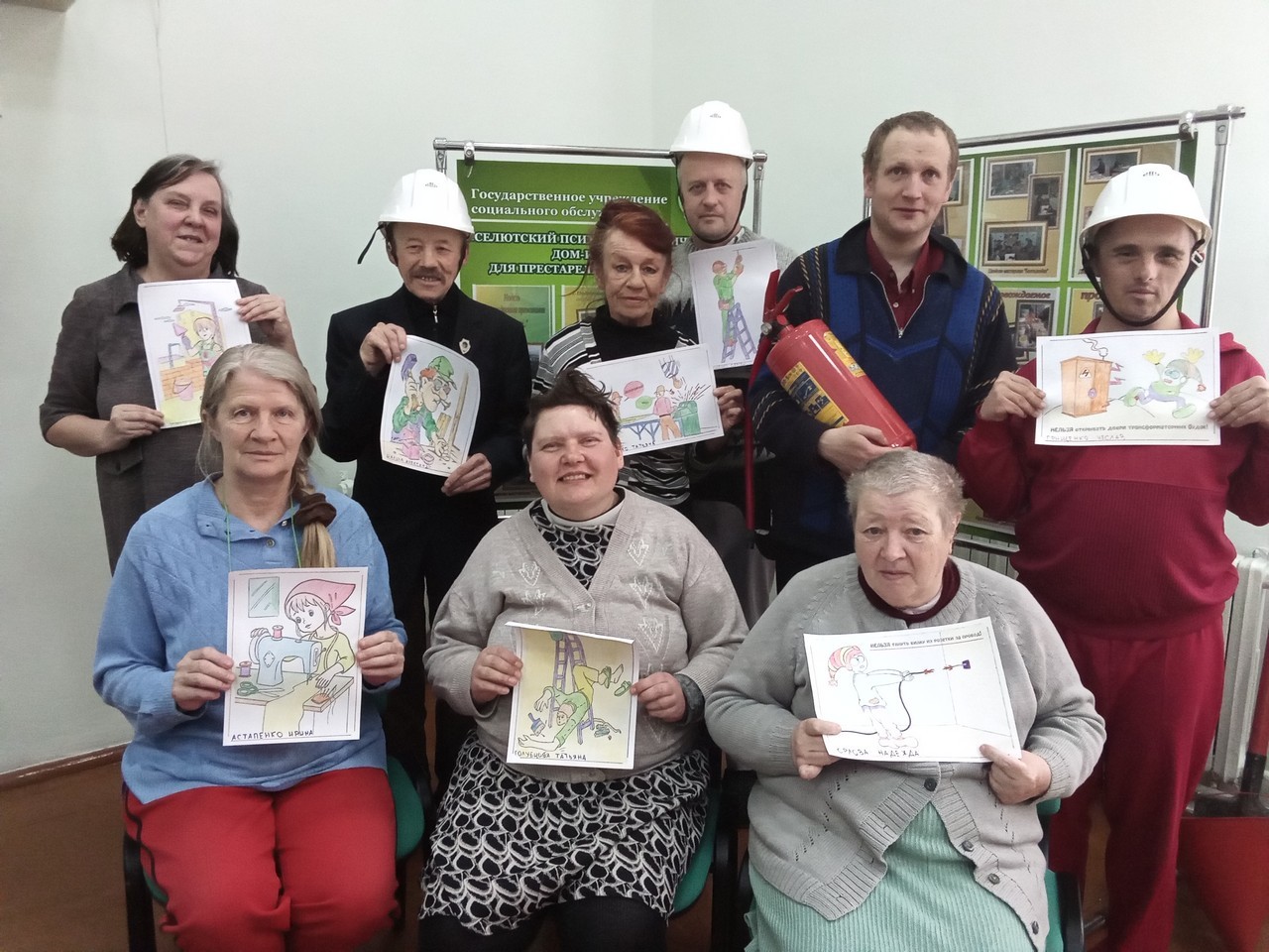 Ежегодное проведение дня охраны труда – не иключение и в нашем доме-интернате. Состоялась видео-беседа «28 апреля - Всемирный день охраны труда», во время которой проживающие отвечали на вопросы, связанные с правильным обращением с розетками, электро - и бытовыми приборами, такими, как электрочайник, тостер, микроволновая печь, телевизор, компьютер, стиральная и швейная машины; раскрасили плакаты, предупреждающие о трагических последствиях небрежного отношения с огнём, электрическим током и предметами трудовой деятельности: лопатами, граблями, носилками, молотком. А затем оформили плакатами стенд в отделении.