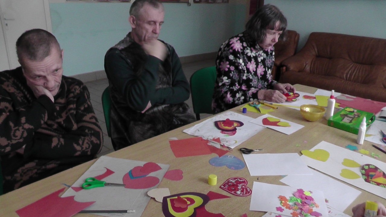 Едва успели убрать все ёлки, как тут же стали готовиться к международному празднику всех влюблённых — Дню святого Валентина. Инструкторы по трудотерапии, а также наш волонтёр, руководитель «Школы изящных искусств», вместе с подопечными мастерили из цветной бумаги, картона милые сердечки, открытки, используя для этого вырубку и зразы, украшали стенды раскрасками, посвящёнными празднику влюблённых.