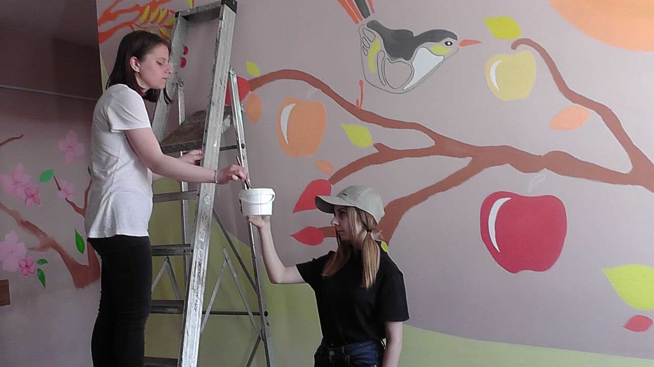 Четыре юные студентки 3-го курса художественно-графического факультета ВГУ им. Машерова, кафедра «Дизайн предметно-пространственной среды»-Лемнева Анастасия, Пушкель Алеся, Скроба Анастасия и Тершко Вероника проходили свою практику в нашем доме-интернате. В результате их кропотливого труда холл 3-го отделения, в котором проживающие смотрят телевизор, играют в настольные игры, читают книги и периодическую печать, рисуют, словом проводят достаточно много времени, особенно в зимний период, стал необыкновенно красочным и уютным.