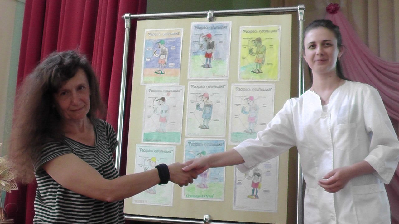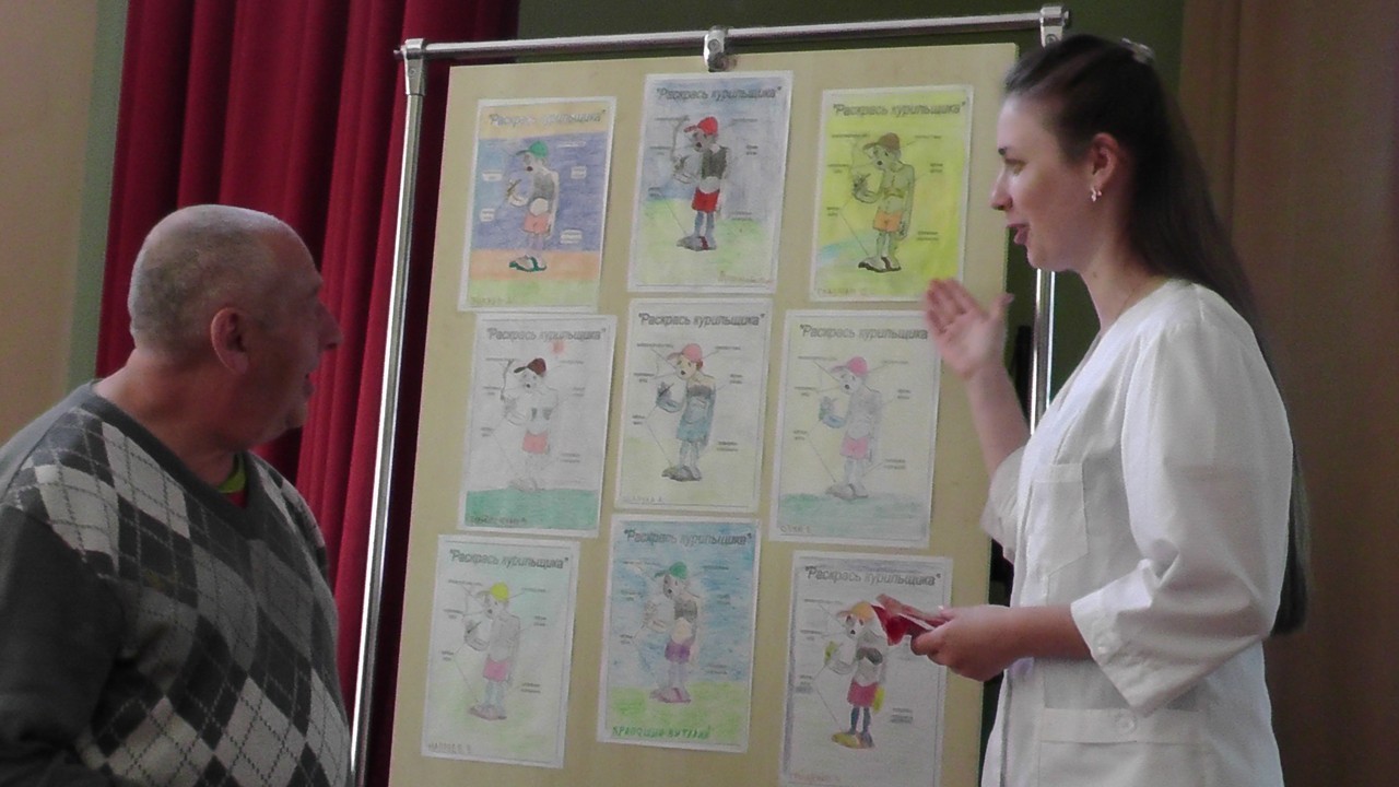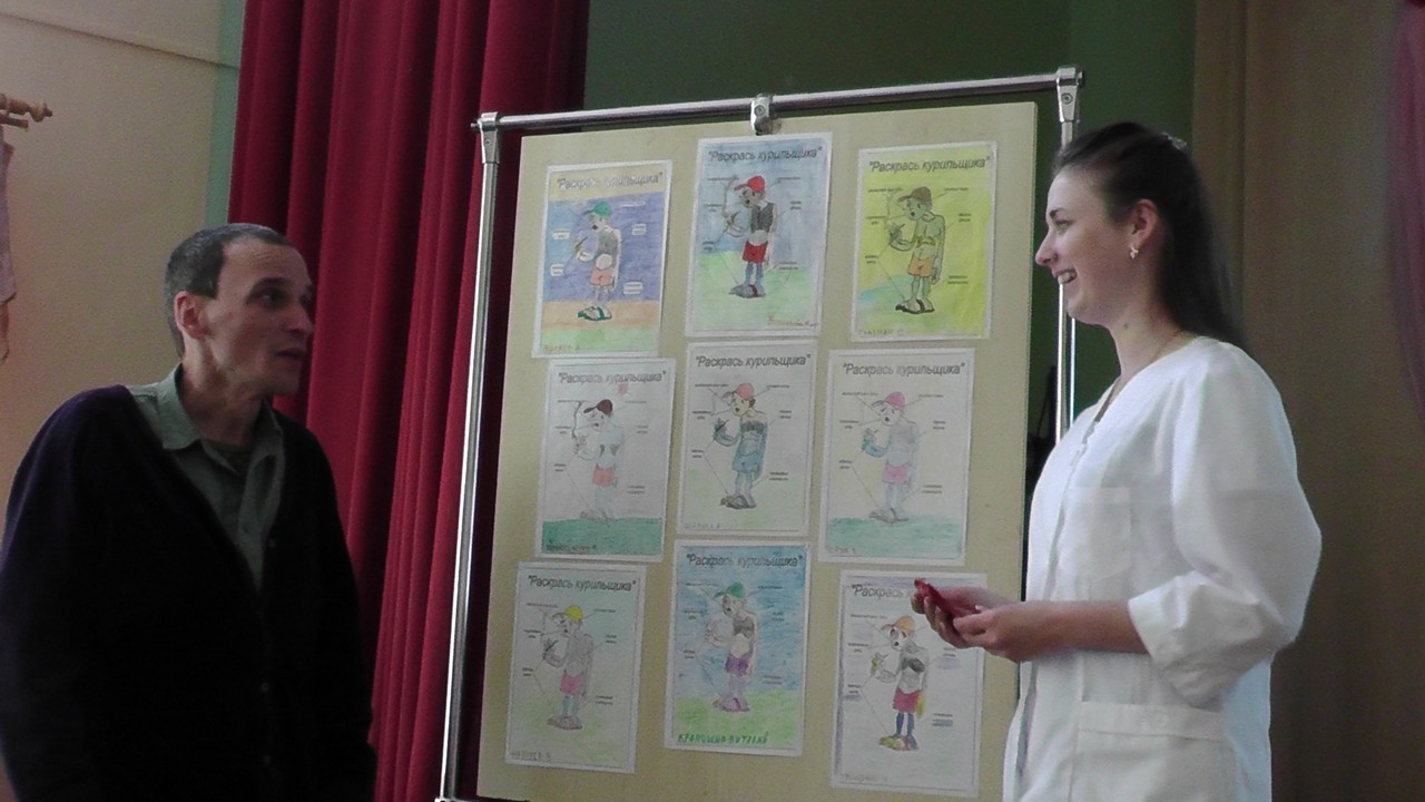 Подвели итоги конкурса «Раскрась курильщика». Первое место завоевала Оксана В. Курильщик у неё получился самый страшный с чёрными, как ночь, лёгкими. Второе место досталось Алексею Ф., а третье - Олегу Г. Но, откровенно говоря, «Курильщики» у всех участников этого конкурса получились правдоподобными.