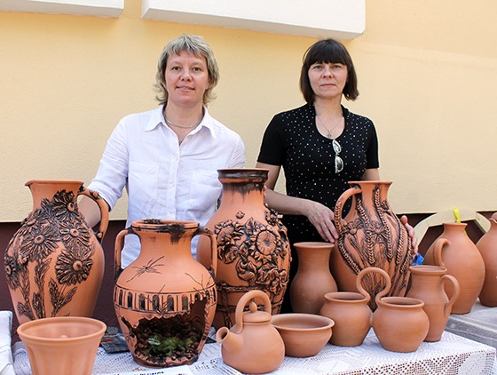 Ни одного пленэра не пропустила в Октябрьской Елена Рыжанкова из Новолукомля. На этот раз она приехала с коллегой по мастерской художественной керамики завода керамзитового гравия Галиной Кедо. Мастерицы привезли с собой удивительные изделия — объемные и миниатюрные, гладкие и украшенные замысловатыми узорами. Вазы, кувшины, чашки, панно, глиняные скульптуры пригодятся в каждом хозяйстве и украсят любой интерьер.