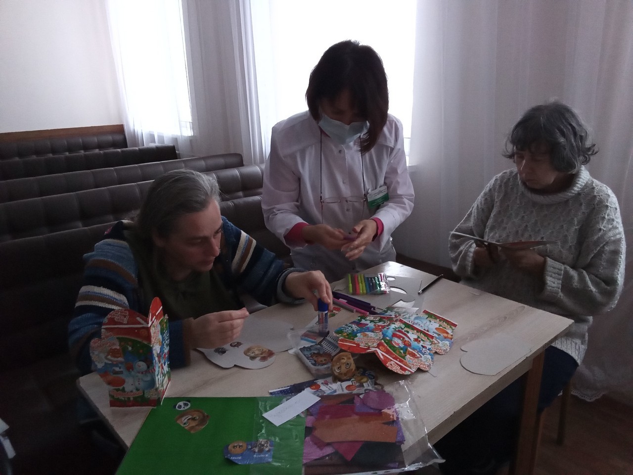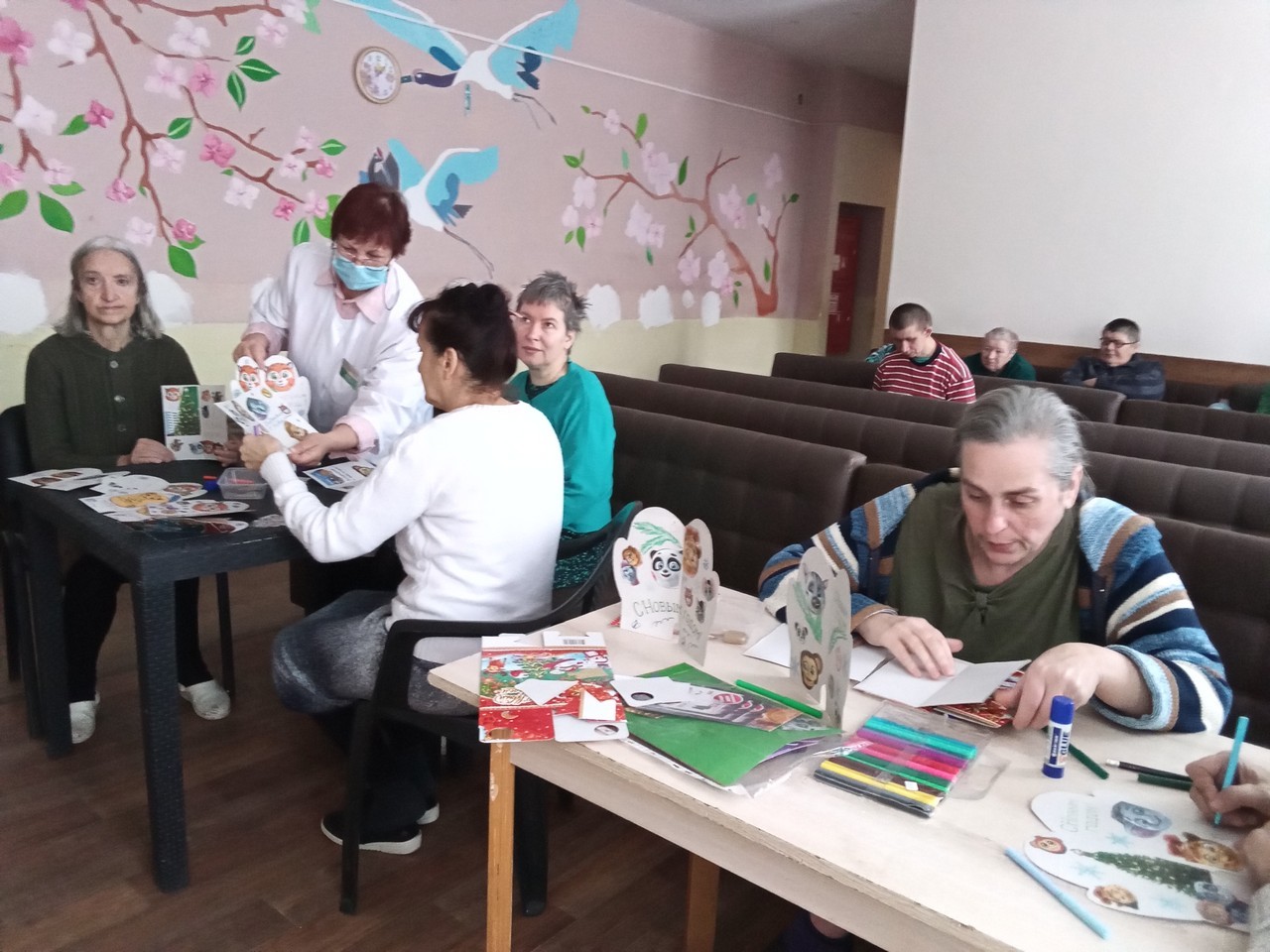 Самый добрый и самый лучший праздник — это, конечно, Новый год. К нему все готовились заранее. С первых же дней декабря приступила к работе «Мастерская Деда Мороза». Наши подопечные на занятиях кружка по бумагопластике «Креативная студия» под руководством инструкторов по трудотерапии и руководителей кружков мастерили из цветной бумаги новогодние фонарики, поздравительные открытки «Ёлочка», «Волшебный мешок с подарками», «Рукавичка». На занятиях кружка по арт-терапии «От точки к точке» — руководитель — Грищенко Любовь Андреевна — подопечные раскрашивали сюжеты на новогоднюю тему, потому что впереди их ждали видеобеседы «С днём рождения, Дед Мороз!», «История обыкновенной варежки» и викторина «Что мы знаем о родине новогодней игрушки?».